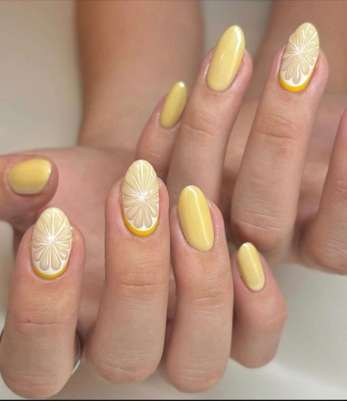 Грейпфруты, апельсины, лимоны, лаймы, – все виды цитрусовых очень популярны в дизайнах маникюра этой весны.
