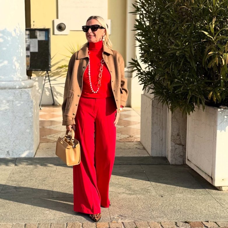 Сочный алый оттенок подчеркивает индивидуальность своей обладательницы. Чтобы не перегрузить образ, дополните его бежевой шерстяной курткой, сумкой и принтованной обувью, готово!