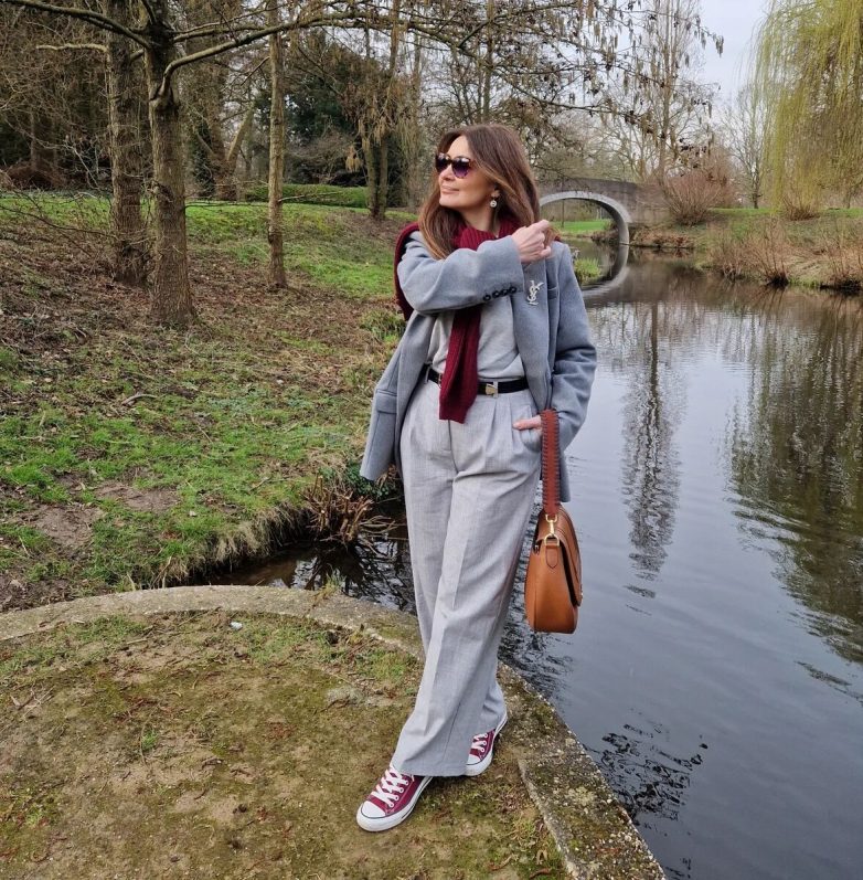 Наряд в одном цвете модницы часто дополняют акцентными деталями. Дуэт ахроматического серого и бордового цвета выигрышно смотрится в любой жизненной ситуации.