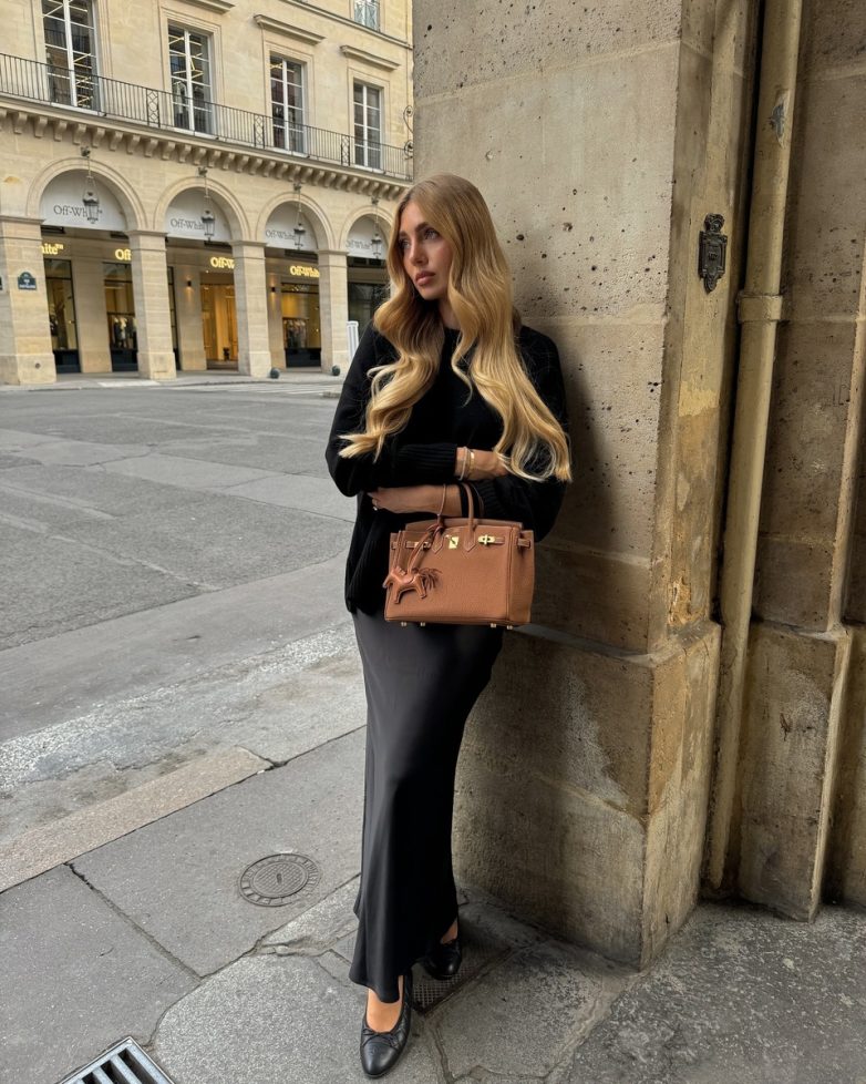 Образ, состоящий из черной одежды, не всегда выглядит мрачно. Напротив, черный цвет ассоциируется с элегантностью и сдержанной роскошью, бежевая сумка ничуть не выбивается из весеннего ансамбля.
