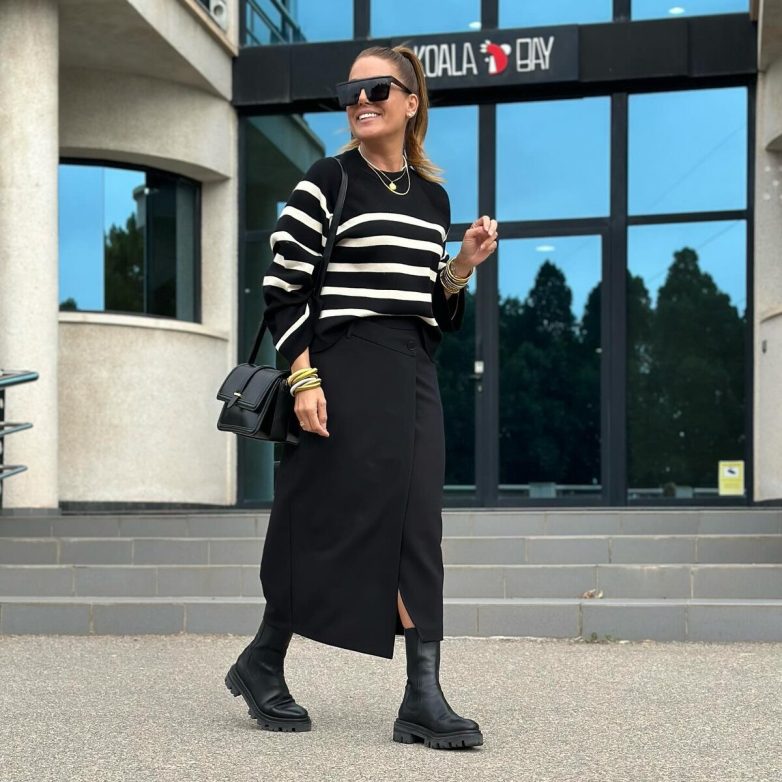 Черный монохром можно «разбавить» контрастным белым принтом. Если выбор пал на полоску, остановитесь на принте среднего масштаба.
