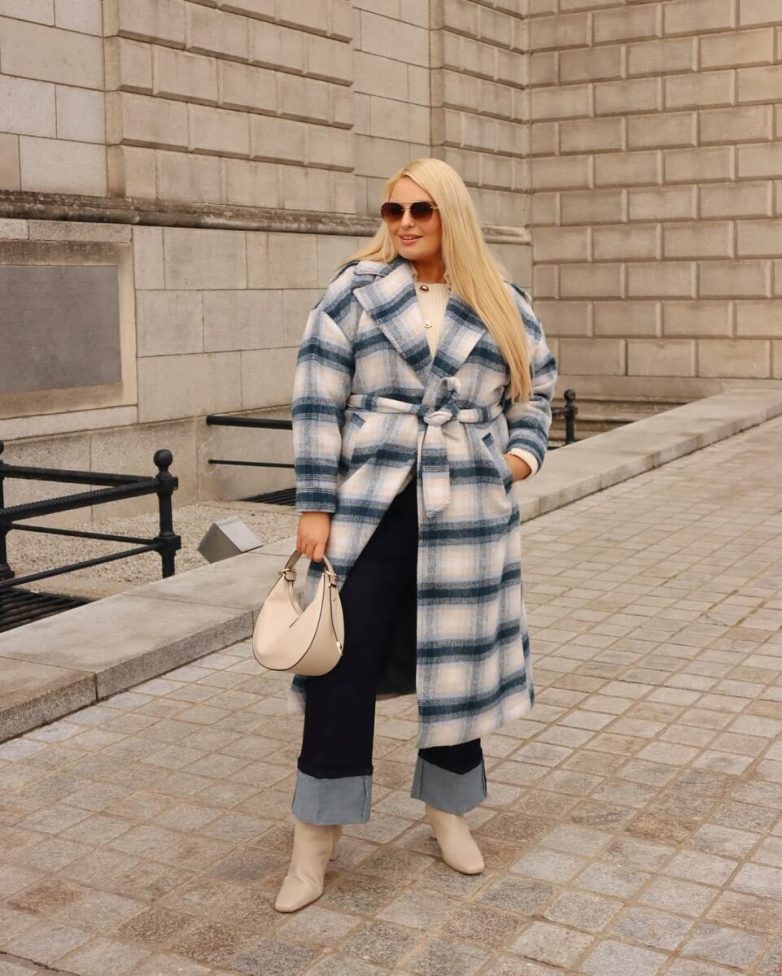 Этот образ идеально подойдет для первых весенних дней, когда хочется легкости и комфорта, не жертвуя стилем. Длинное пальто в клетку, сочетающее бежевые и нежно-голубые оттенки, сразу создает весеннее настроение. Акцент на талии – благодаря поясу. Темно-синие джинсы с подворотами и светлые ботильоны с сумкой-хобо добавляют образу непринужденности, поддерживая общую пастельную гамму. Клетка – беспроигрышный вариант, всегда актуальный и добавляющий динамики.