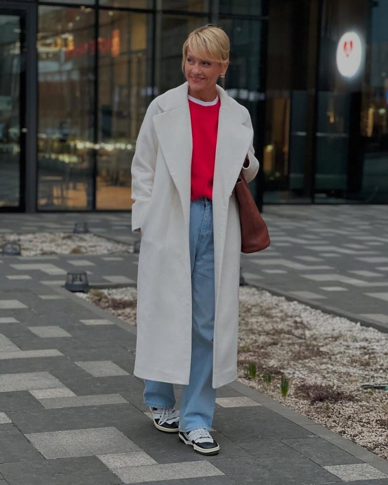 Этот образ – отличное доказательство того, что базовые вещи могут выглядеть очень стильно. Основа – светло-голубые джинсы прямого кроя и яркий алый свитер, который сразу привлекает внимание и создает весеннее настроение. Сверху – белое пальто длины макси, которое добавляет образу шика и защитит от весенней прохлады. Комфортные кроссовки поддерживают непринужденный стиль и добавляют образу динамики. Этот образ простой, но в то же время эффектный, идеально подойдет для прогулок, походов по магазинам или встреч с друзьями.