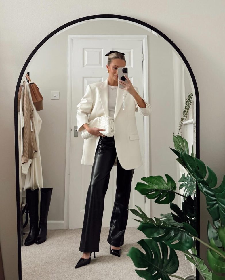 Кожаные брюки сделают даже самый простой комплект интересным. Чтобы добавить образу элегантную нотку, дополните брюки футболкой, роскошным молочным жакетом, изящной обувью на каблуке, клатчем.