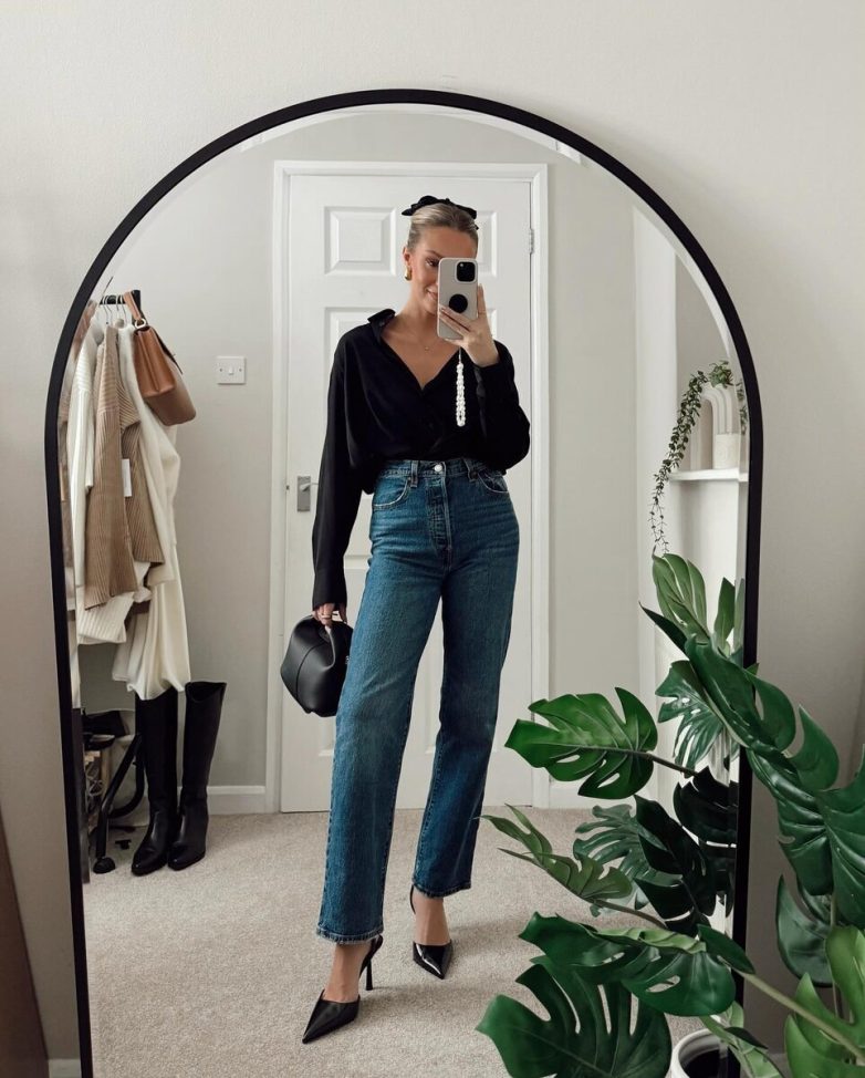 Синие джинсы – удачное и очень практичное решение на весну. Такая модель легко подружится с одеждой ахроматического черного цвета или белого.