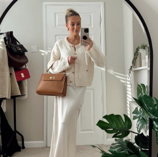 Еще один монохромный наряд для самых женственных и утонченных натур. Длинное белое платье + жакет молочного оттенка + бежевая сумка + лаконичные босоножки – красиво и современно!