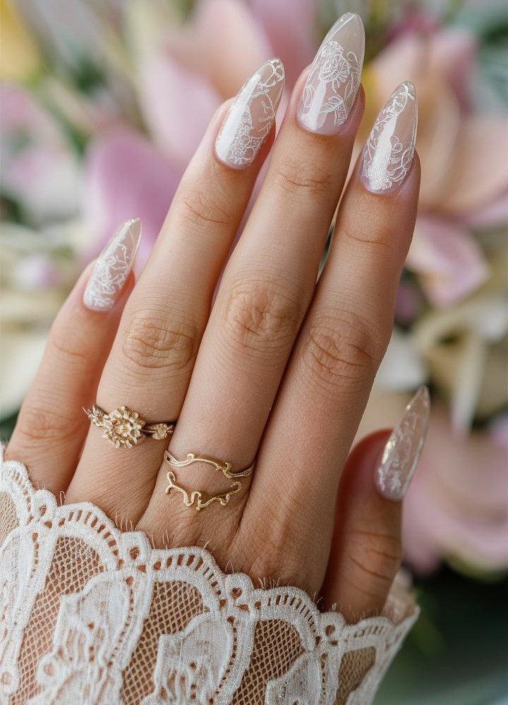 Мягкий полупрозрачный фон подчёркивает замысловатые белые цветочные узоры, отражая сочетание элегантности и женственности. Удлинённая миндалевидная форма добавляет изысканности, делая этот маникюр идеальным для тех, кто хочет выглядеть утончённо и изысканно.