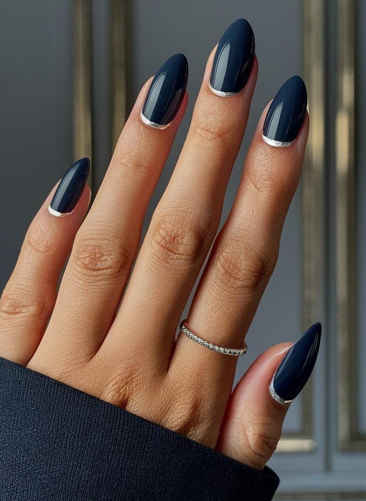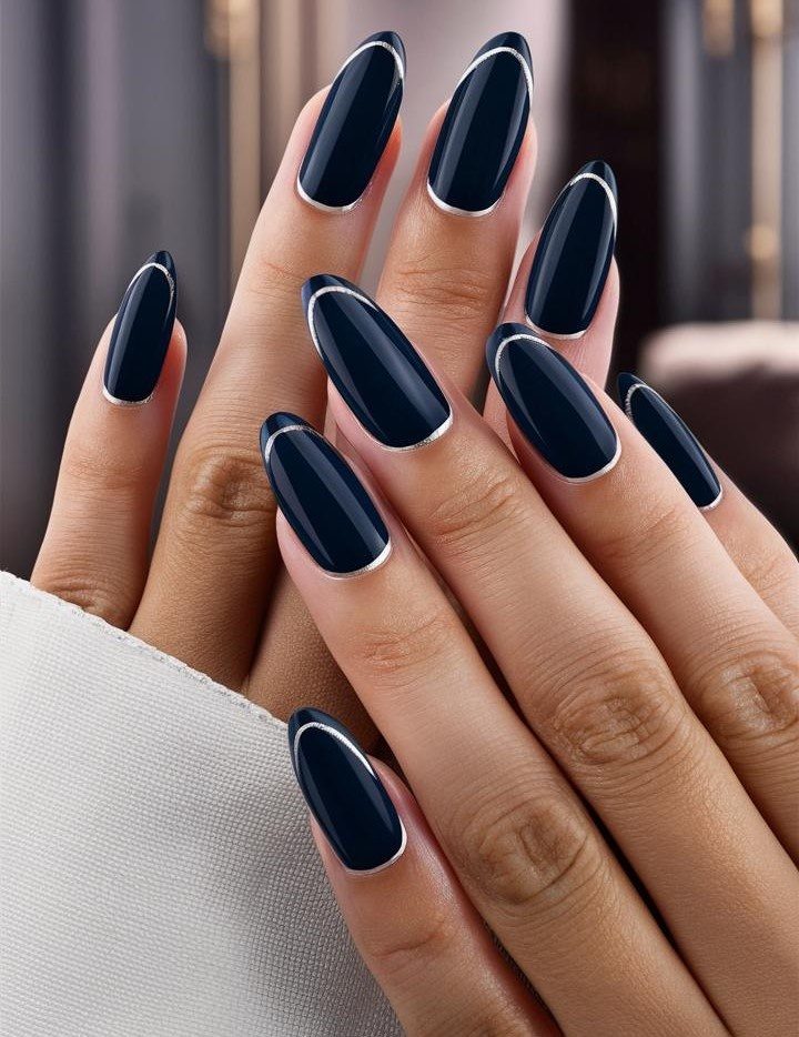 Глубокий тёмно-синий цвет основы создаёт смелый, но элегантный нейл-образ, который прекрасно дополняется изящным серебристым контуром на кончиках пальцев.