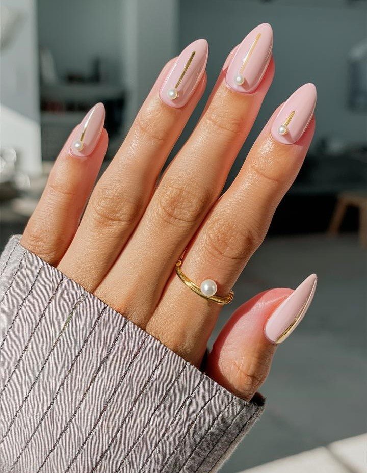 Мягкий оттенок розового служит идеальным фоном для изящных золотых линий и перламутровых деталей, формируя изысканный маникюр, сочетающий в себе современность и классическую элегантность.