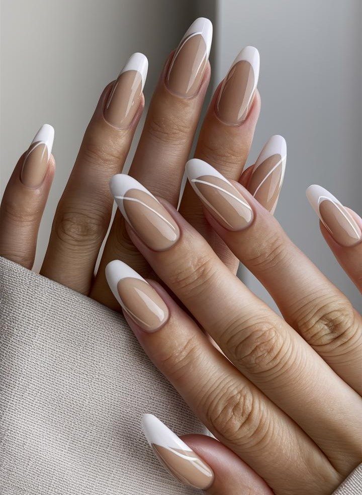 Ногти элегантной заострённой формы выполнены в шикарной нюдовой и белой цветовой гамме с художественными белыми линиями, которые создают сложный геометрический узор. Такой маникюр подойдёт всем, кто хочет выглядеть ухоженно и элегантно.
