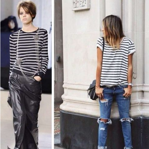 Джинсы и тельняшка — классика, но чтобы образ выглядел современно, выбирайте необычные фасоны. Например, джинсы с завышенной талией и прямым кроем или актуальные в этом сезоне бермуды из денима.