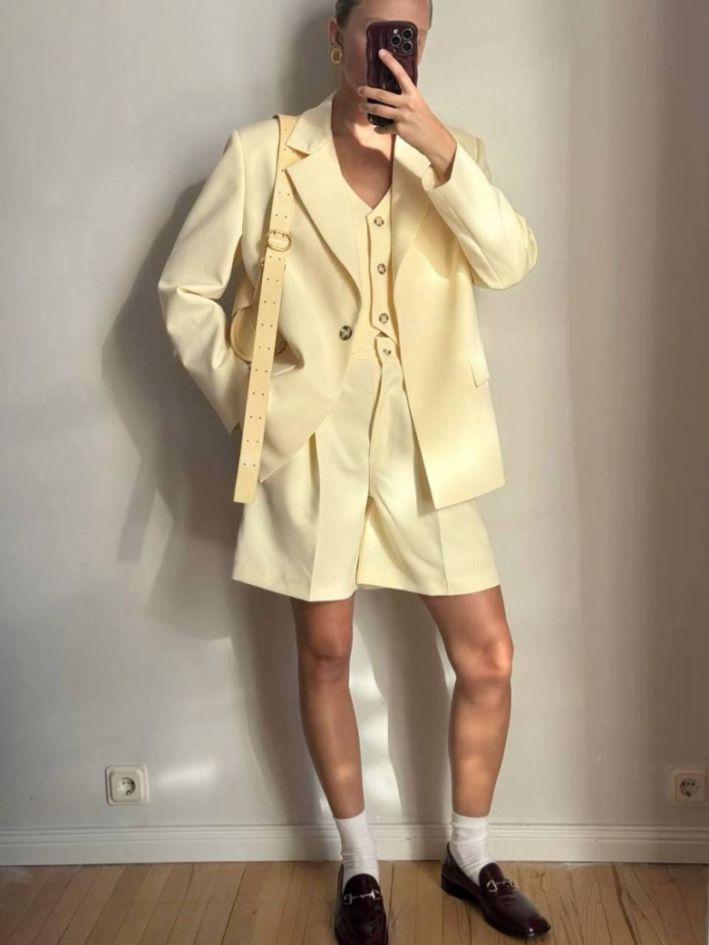 С брюками: Интересно смотрятся сочетания с широкими брюками в тон или контрастного цвета, создавая расслабленный, но элегантный костюмный образ. Можно попробовать носить и с бермудами или капри для более авангардного вида.