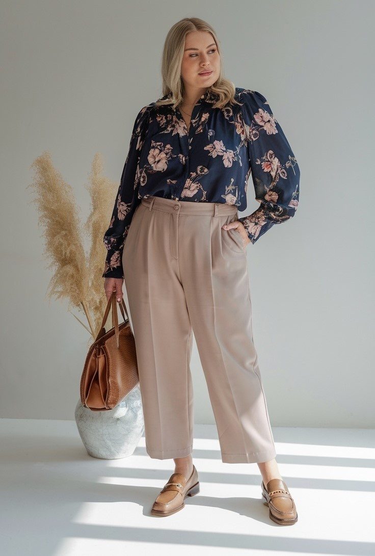 Блузка насыщенного тёмно-синего цвета украшена нежными цветочными принтами, а светлые брюки создают изысканный контраст. Образ дополнен сумкой и удобными лоферами. Этот ансамбль идеально подходит для тех, кто ищет элегантный, но комфортный образ, подходящий как для деловой обстановки, так и для повседневных прогулок.