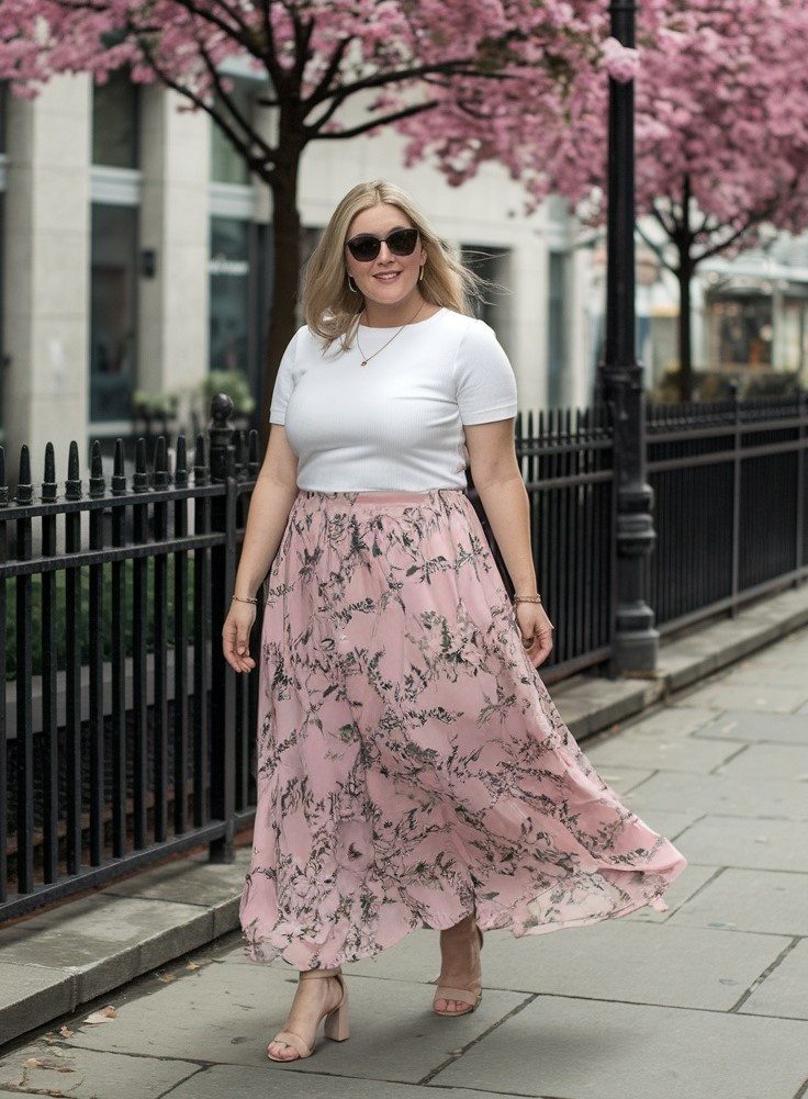 Приталенный белый топ струящаяся, принтованная юбка и босоножки на устойчивом каблуке — женственный и комфортный образ для повседневных весенних будней.