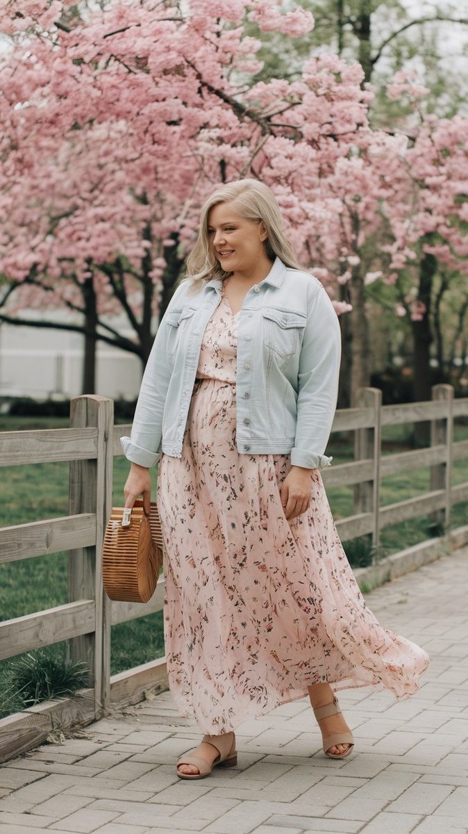 Струящееся платье макси с цветочным принтом хорошо смотрится с лёгкой джинсовой курткой. Чтобы чувствовать себя уверенно и комфортно наряд можно дополнить стильными сандалиями на танкетке и плетёной сумкой.