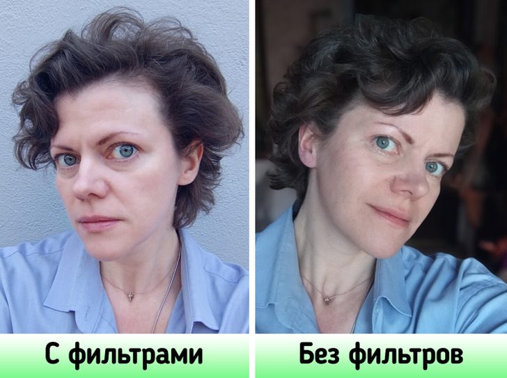 Я считаю, что нет ничего плохого в фильтрах — кто-то действительно пользуется ими виртуозно. Но собственное лицо, обработанное простейшими программами в телефоне, меня откровенно пугает. Перед тем как сделать селфи, я выбрала два фильтра: один убирал морщины, другой делал лицо более худым. Результат меня не вдохновил: физиономия казалась какой-то резиновой и мультяшной, словно ее нарисовал искусственный интеллект. Лучше уж останусь при своих морщинках.