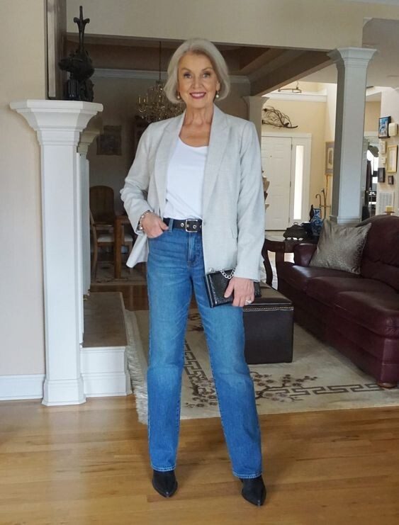 Чтобы выглядеть свежо и современно, женщине 60+ достаточно надеть белые брюки из денима (при желании добавить темный ремень), такого же цвета топ или футболку и джинсовую куртку-жакет. Подходящая обувь – бежевые босоножки на платформе. В качестве яркой детали может выступать аккуратная сумочка (к примеру, красная).