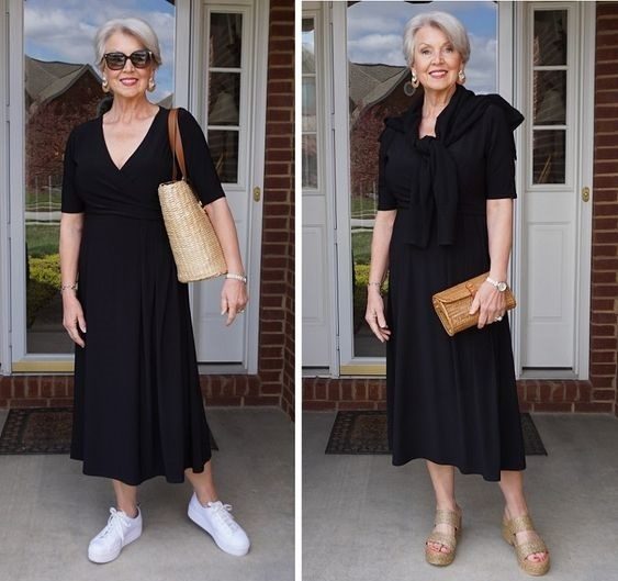Сочетание черного и белого является вечной классикой. Темное платье-футляр длиной миди с разрезом спереди прекрасно дополнит светлая джинсовая куртка. Обувь лучше всего выбирать на танкетке и неяркой расцветки. Аксессуаров должно быть по минимуму: достаточно подвески с бусинами и серег-гвоздиков.
