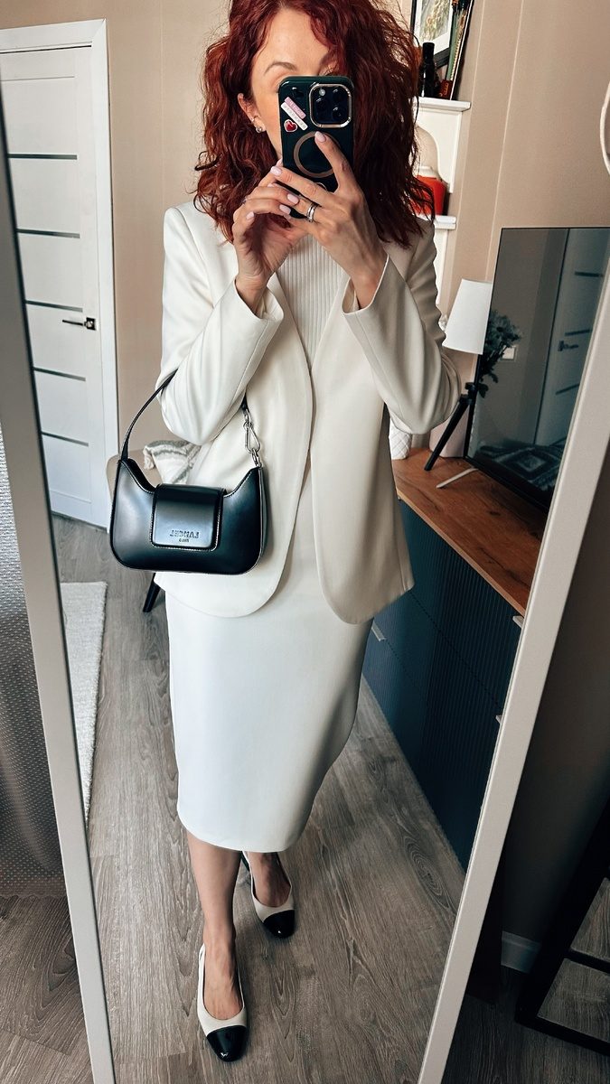 Однотонный светлый костюм всегда смотрится красиво. После смещения модного акцента в сторону «миди», такая длина юбки может казаться непривычной, но именно на нее делают ставки дизайнеры по всему миру и возвращают ее в женский гардероб.