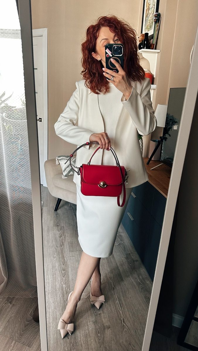 К такому костюму подойдет белая сумка, бежевая, мятная, шоколадная или в цвете какао. На мой вкус идеально будет именно с белой, а если у нее еще и лимонная фурнитура, то вообще топ.