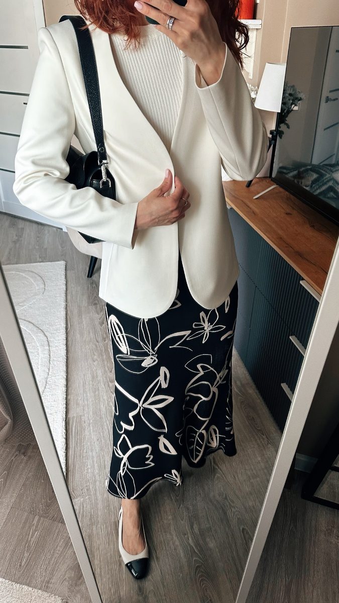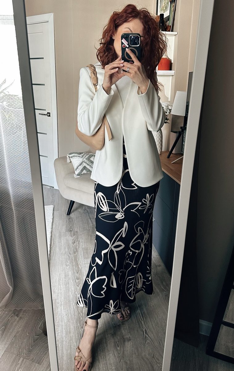 Если целиком костюмом кажется «скучно», то разбиваем и носим однотонные жакеты с акцентными юбками. Такие образы всегда смотрятся чуть легче полностью костюмных, но благодаря длине юбке и строгому жакету, они все равно подходят рабочему гардеробу, ну а не рабочему тем более.