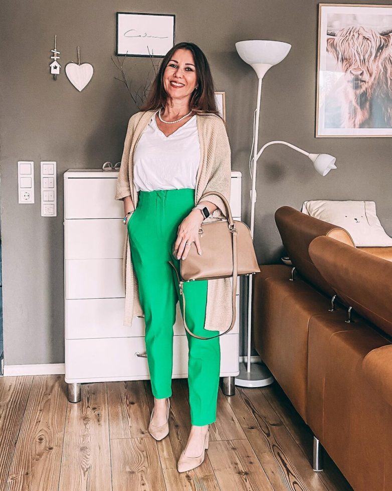 Травяной зеленый цвет способен «оживить» даже самый базовый наряд. Он чудесно сочетается с ахроматическим белым, нейтральными оттенками бежевого.