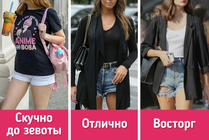 Коротенькие джинсовые шорты идеально подходят для летней жары, но создать элегантный образ на их основе — задачка со звездочкой. В сочетании с яркой футболкой они смотрятся слишком просто и скучно. В таком виде можно разве что в магазин за продуктами выскочить.
