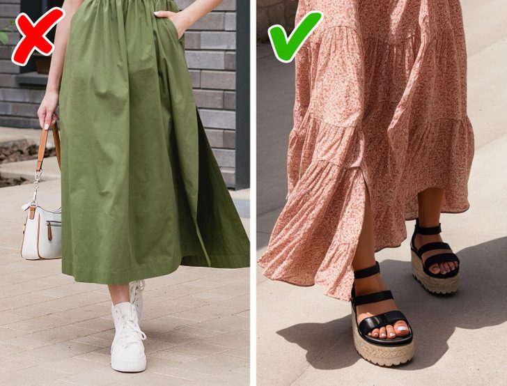 Идеальный вариант — длинная струящаяся юбка в стиле бохо. Она создаст отличный контраст с обувью. А вот с простыми кроссовками макси-юбка может показаться излишне простой.