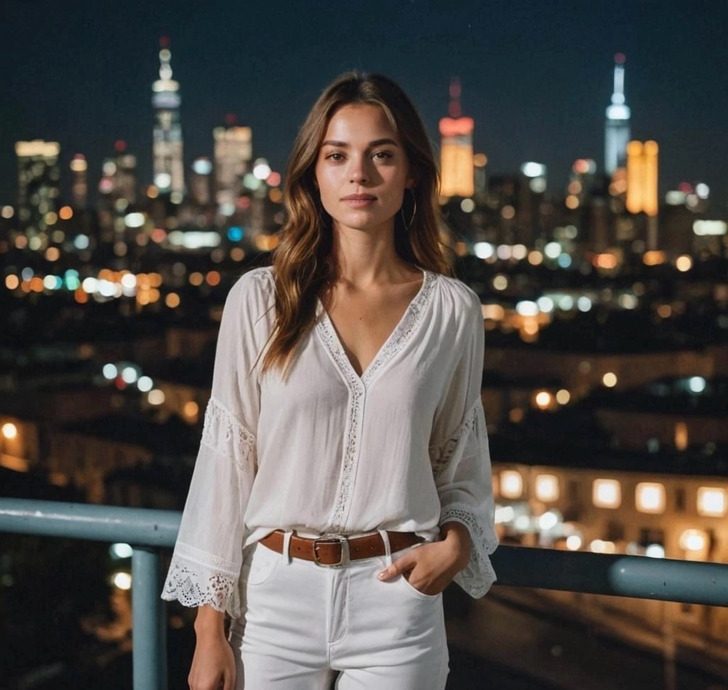 Белая бохо-блузка с кружевными вставками и свободным кроем идеально сочетается с белыми брюками, создавая свежий образ. Этот лук в духе весенних модных трендов подчеркивает любовь к натуральным тканям и воздушным силуэтам.