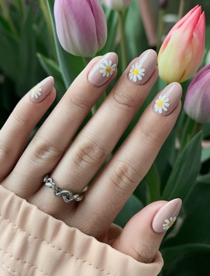 Маникюр с мягким нюдовым покрытием, украшенный нежными белыми ромашками, которые идеально передают суть этого времени года. Этот образ идеально подходит для тех, кто ценит в нейл-арте природные мотивы.