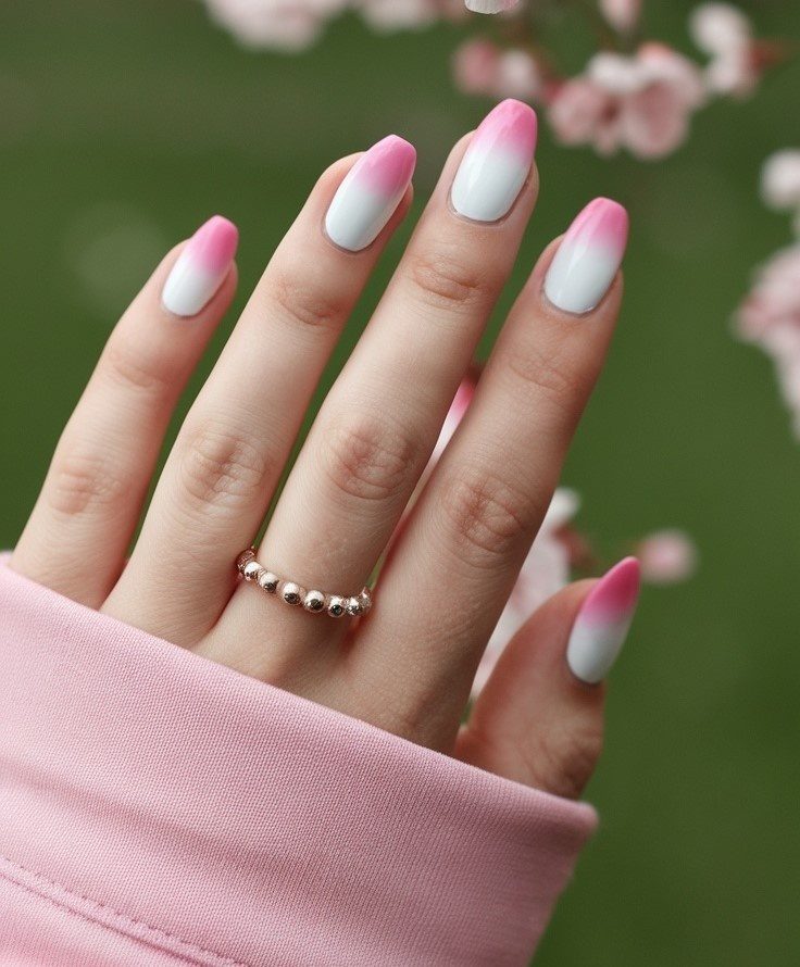 Восхитительный весенний маникюр с красивым эффектом омбре в розовой гамме на белом фоне, который идеально передаёт игривый дух этого времени года. Омбре придает неповторимый акцент, не теряя при этом изысканности. Чтобы маникюр дольше выглядел свежим, обязательно нанесите защитное верхнее покрытие, которое усилит цвета и продлит стойкость этого очаровательного маникюра.
