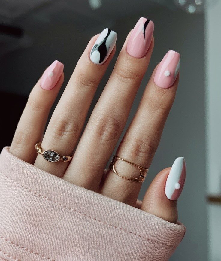 Шикарный и современный вариант весеннего маникюра с прекрасным сочетанием нежно-розового и чистого белого цветов с яркими чёрными акцентами.