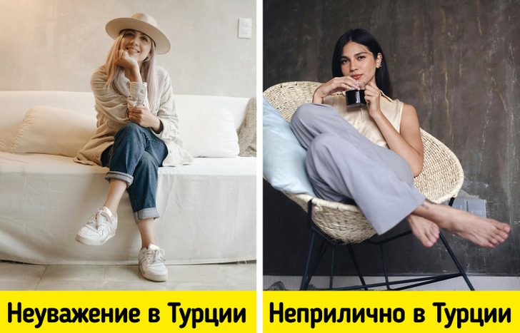 Во время посещения Турции нежелательно сидеть нога на ногу, это может быть воспринято как проявление неуважения, особенно по отношению к пожилым людям. В отеле, возможно, на подобные жесты не обратят внимания, а при прогулке в городе лучше быть аккуратнее. Сидеть в общественных местах, например, в кафе или ресторанах, показывая подошвы, считается неприличным.