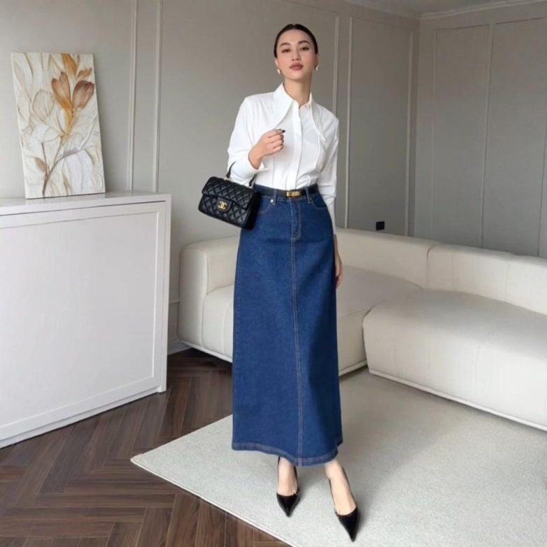 Не стоит забывать о классике. Рубашку белого цвета можно «оживить» с помощью длинной джинсовой юбки. Остроносые туфли перекликаются по цвету с фактурной сумкой и тонким кожаным поясом.