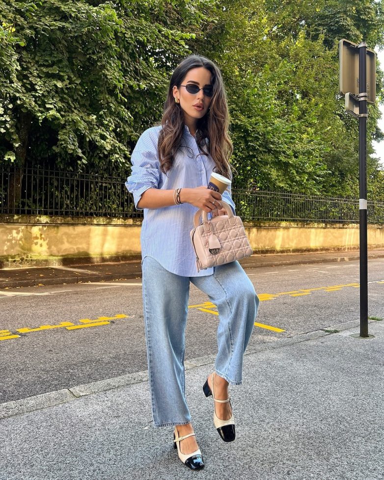 Голубые рубашки с вертикальным принтом не выходят из моды! Рубашка + джинсы прямого кроя + босоножки с контрастным мысом + пастельная сумочка – незамысловатый сет на каждый день.