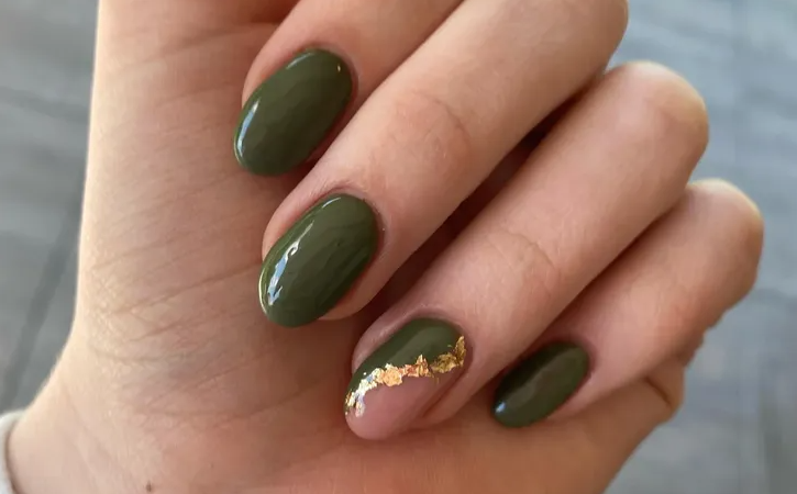 Оливковый зеленый — хит летнего маникюра. Он отлично подчеркивает тон кожи. А в сочетании с трендовыми золотыми деталями смотрится еще стильнее. Кроме того, вкрапления золота советуют попробовать на ногтях ярких цветов.