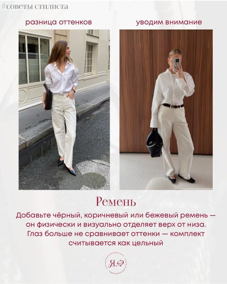 В итоге: Вы не отказываетесь от белых комплектовНе мучаетесь с поиском «идеально совпадающих» оттенковА просто умело стилизуете то, что уже есть в гардеробе
