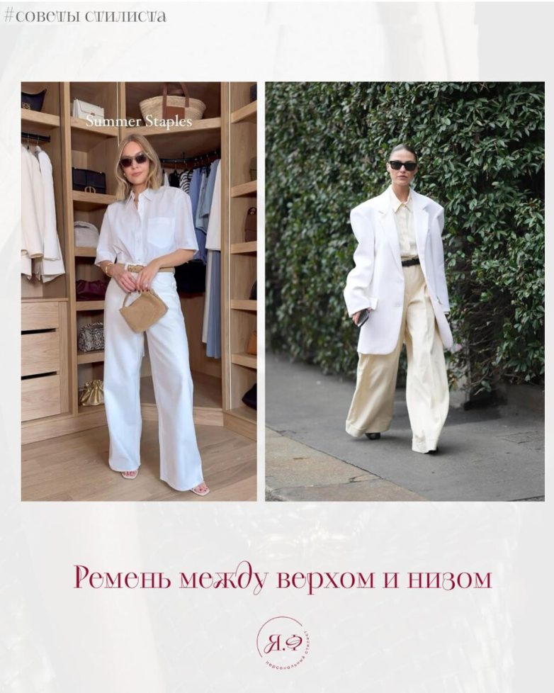 Чёрный, коричневый, бежевый — любой, который впишется в образ и будет смотреться уместно.Ремень работает как визуальная «граница» между верхом и низом. Он разделяет два белых оттенка, и наш глаз больше не воспринимает их как прямое сравнение.