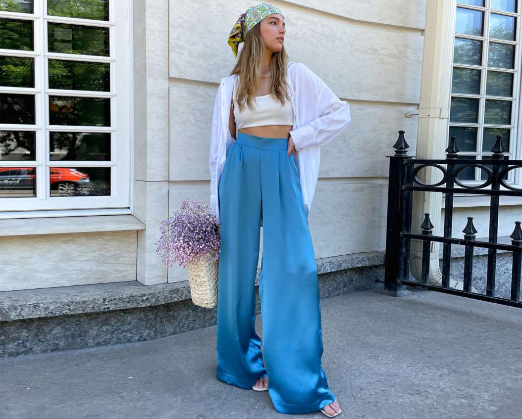 На выход можно добавить к атласным палаццо топ с тонкими бретелями или актуальную в этом сезоне сетку, структурированный жакет или блестящий клатч. Главное — не делать образ театральным: украшений должно быть немного, а макияж — сдержанным. Даже в вечернем комплекте важно оставить пространство для легкости — не забывайте, что в моде сейчас изящная естественность.
