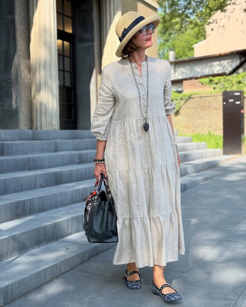 Обувь: комфорт и устойчивость — главные критерии. Сандалии на низком ходу, эспадрильи, лоферы, мюли, балетки. Если каблук, то устойчивый и невысокий.Сумки: отдавайте предпочтение структурированным сумкам среднего размера, плетеным сумкам для летнего сезона.Украшения: выбирайте изящные, не перегружающие образ украшения. Жемчуг, натуральные камни, элегантные серьги или подвески.Солнцезащитные очки и головные уборы: стильные очки и элегантные шляпы из соломы не только защитят от солнца, но и добавят изысканности.