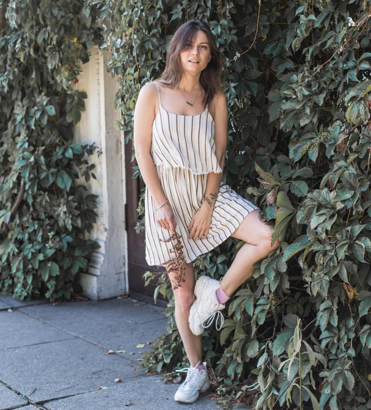Такое платье с кроссовками — одно из удобных сочетаний, которое можно смело выбирать для долгой прогулки. Образ получится одновременно нежный и ноги не устанут, особенно если кроссовки подобраны с правильно. А в прохладную погоду образ можно дополнить каким-нибудь свитером, к примеру, кашемировым.
