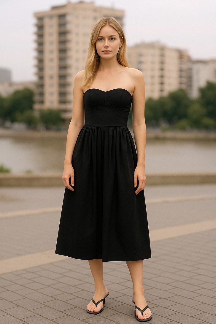 Черное платье — вещь универсальная. В этом сезоне как раз есть повод купить одну из его вариаций — без бретелек. Сопроводить его можно сдержанной обувью — вьетнамками на небольшом каблуке. В таком виде можно пойти и на праздник, и на свидание, и на вечернюю прогулку.