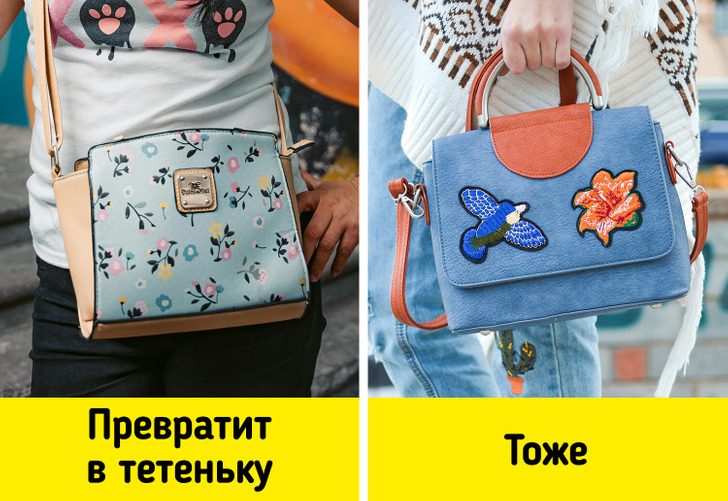 Некоторые эксперты считают, что к вещам с лоскутным шитьем, вышивкой, а также сумкам из ткани, которые можно стирать, нужно относиться с осторожностью. В общем, ко всему, что ассоциируется со сделанным своими руками. Более категоричные модницы советуют вообще обходить стороной модели с любыми принтами.