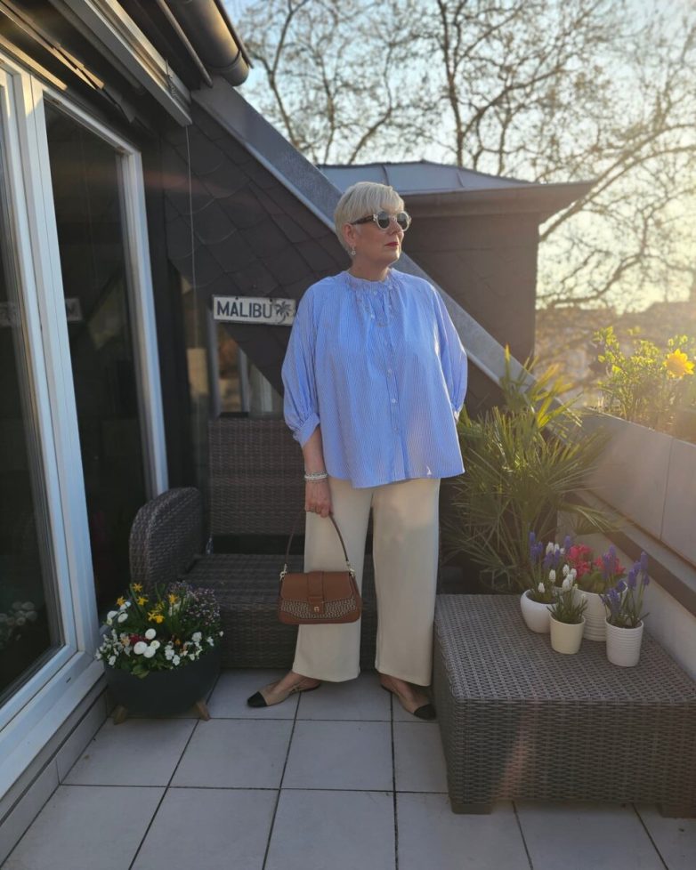 Не менее стильно и непринужденно на даме смотрится рубашка небесно-голубого оттенка. Модель свободного кроя дополняют прямые брюки, балетки, коричневая сумка.