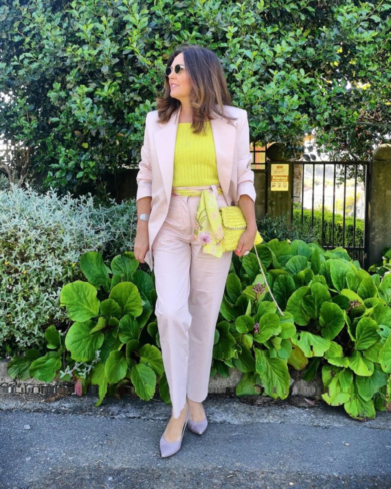 С костюмом-двойкой проще всего составлять разноплановые комплекты на все случаи жизни. Чтобы выгодно омолодить внешность, выбирайте одежду в нежных пастельных тонах.