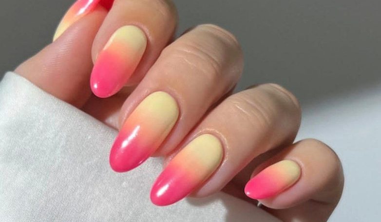 Самый популярный градиент июля – сочетание оттенков в закатной гамме: розовых, оранжевых, персиковых, желтых, красных. Для плавного перехода от одного цвета к другому, создающего эффект мягкой дымки, обычно используют спонж или губку, на которые наносят нужные оттенки и наносят их прихлопывающими движениями.