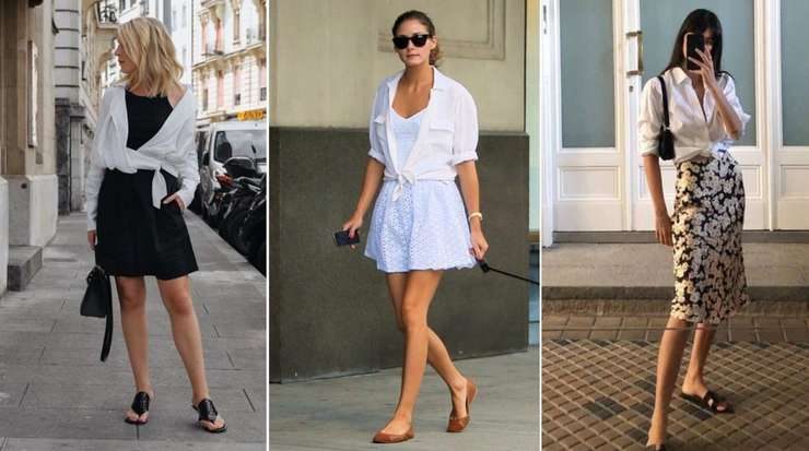 Летом мужская сорочка может с легкостью заменить платье-рубашку. Главное — выбрать удлиненный вариант и не застегивать наглухо верхние пуговицы. «Добавьте к ней кожаный ремень на талии, минималистичные сандалии или эспадрильи, соломенную сумку и очки. Получится соблазнительно, но не в лоб, а с этаким интересным налетом небрежной утонченности», — объясняет эксперт.