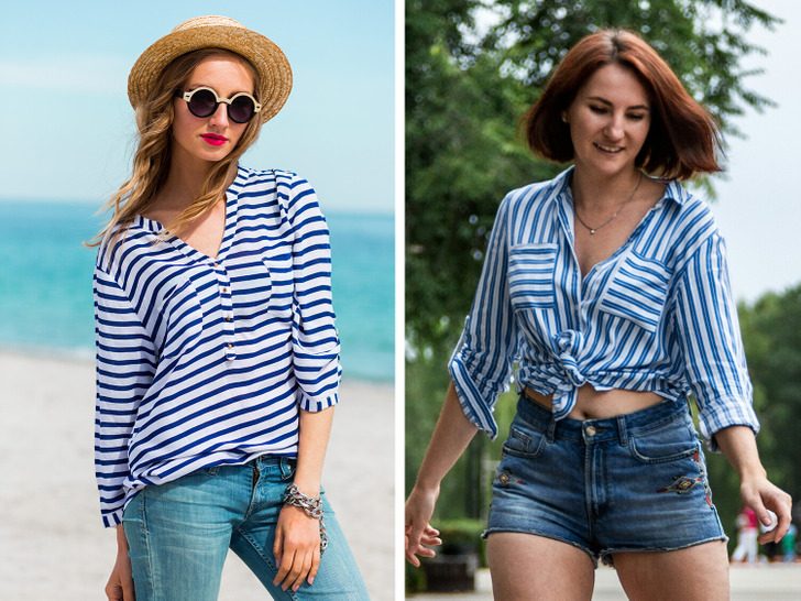 Тут за ностальгическими воспоминаниями нужно будет заглянуть чуть подальше — в 60-е годы прошлого века. Хотя подобные образы регулярно возвращаются на страницы глянцевых журналов. Одежда синих оттенков, свитер с вырезом лодочкой, полоски — составить «морской» образ не сложно. А в нем вы даже в жарком городе сможете хоть ненадолго почувствовать себя так, будто прогуливаетесь вдоль набережной моря.