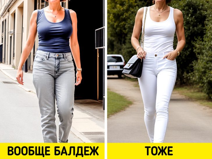 Разный крой белой майки — и образ воспринимается совершенно по-разному. В первом варианте закрытая шея и свободный силуэт делают весь комплект тяжеловатым и простым.
