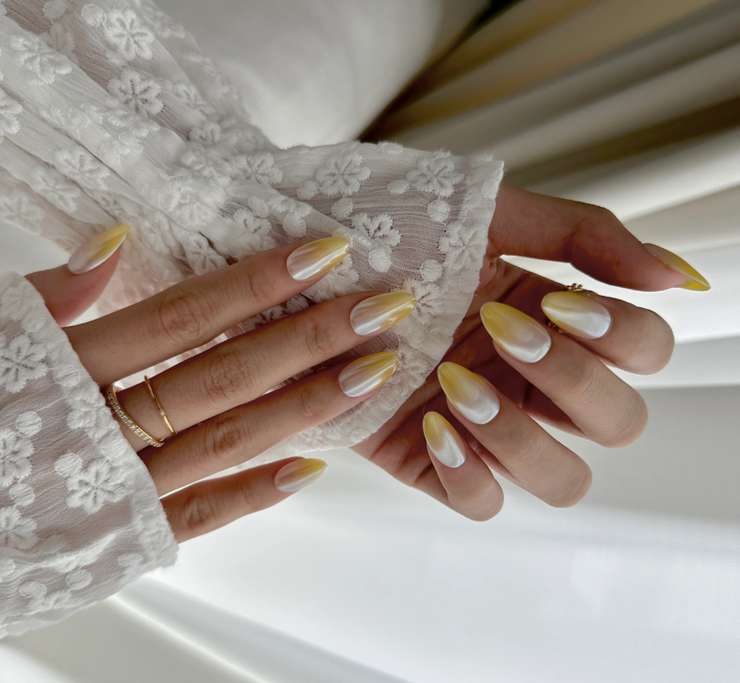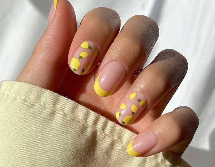 Сам по себе лимонный — уже акцент. «Не стоит перегружать его рисунками, стразами и блестками. Лучше всего работают тонкие золотые полоски, деликатный френч в лимонной гамме, матовое покрытие или один тон без дизайна. Эффектные детали: золотое кольцо на одном пальце, этого достаточно», — говорит мастер.